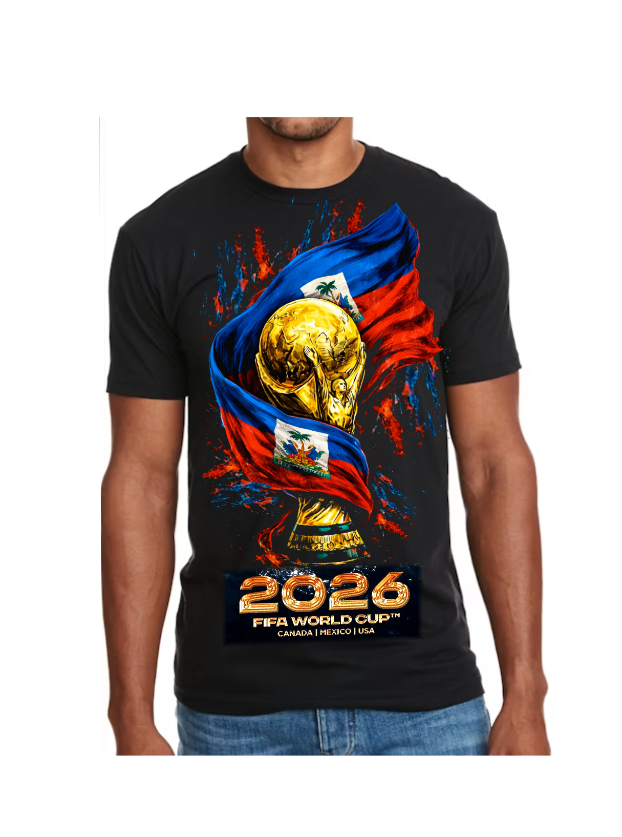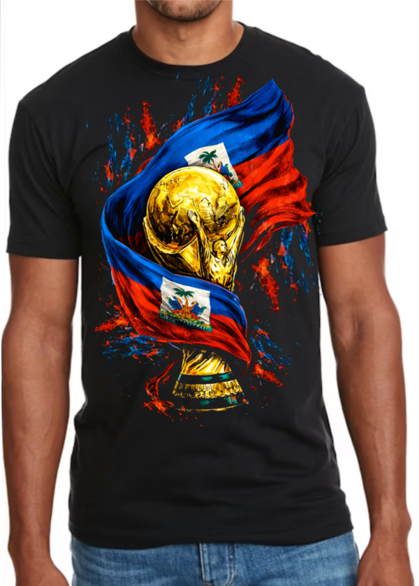 Show your Haitian pride with this bold and powerful design. This premium graphic T-shirt features a stunning golden championship trophy wrapped in the Haitian flag, symbolizing strength, victory, and national pride. The vibrant red and blue colors burst with energy, making this shirt perfect for true fans who love Haiti and the spirit of football.